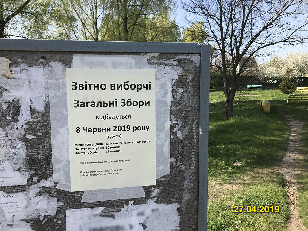 даним фото фіксуємо факт розташування оголошення про Загальні Збори на дошці об'яв на центральній дорозі біля дитячого майданчика